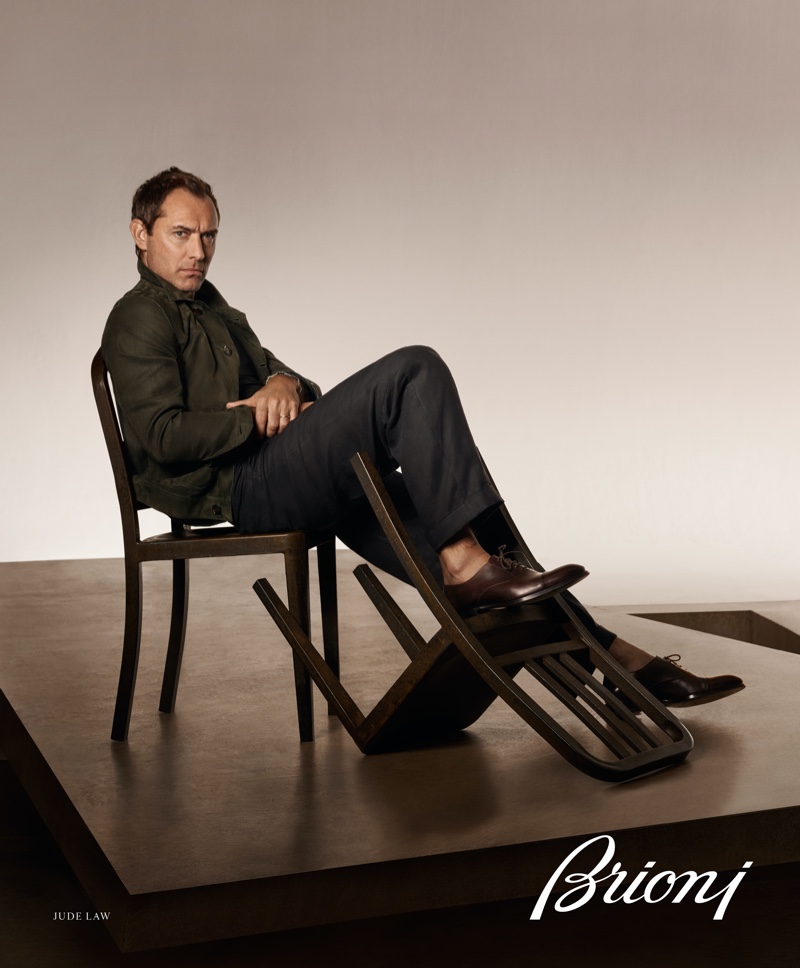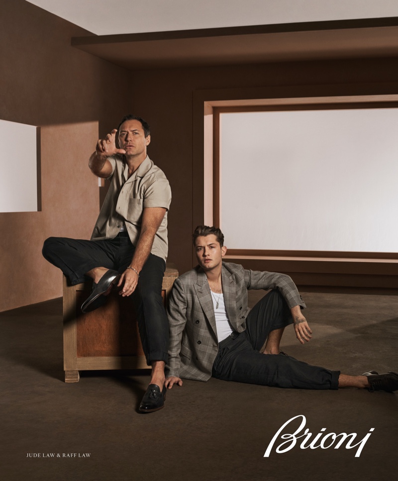 “Dividir o set com o meu pai é muito emocionante. Embora possamos ter gostos e opiniões diferentes, também compartilhamos muitas paixões. Uma delas é o estilo, e sobre Brioni concordamos.” disse Raff Law. “A dedicação da Brioni ao artesanato e à qualidade é uma inspiração para mim. Sempre adorei usar as suas roupas. É uma alegria poder trabalhar com Raff para uma Maison com raízes romanas, criei um vínculo especial com esta cidade durante as filmagens de The Young Pope. Sinto-me maravilhosamente confortável e parece um regresso a casa.” acrescentou Jude Law.