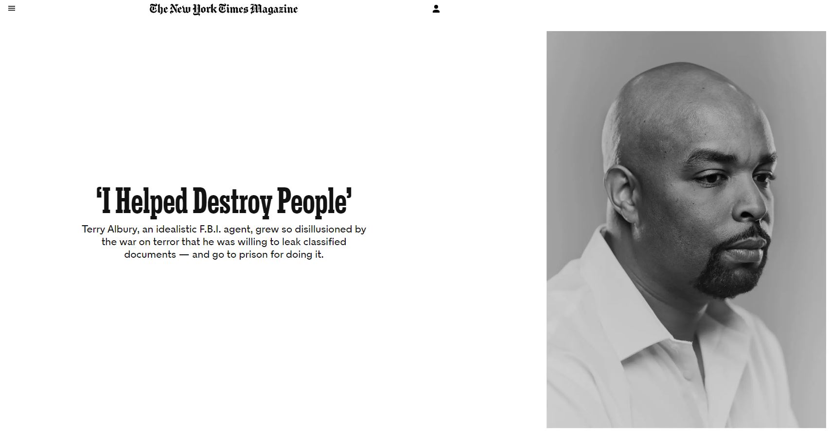 O artigo conta a história do agente FBI Terry Albury – o único agente negro do seu departamento – que foi encarregado de investigar as comunidades muçulmanas após o 11 de setembro. Após 16 anos no cargo, Albury ficou desiludido com a guerra ao terror e começou a divulgar documentos confidenciais, o que acabou por lhe valer uma sentença de quatro anos de prisão.